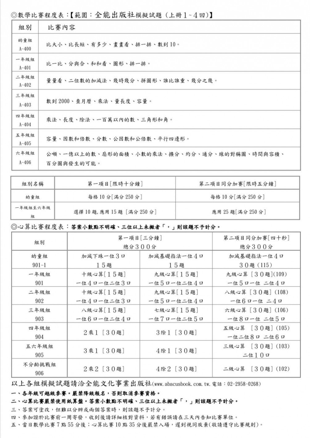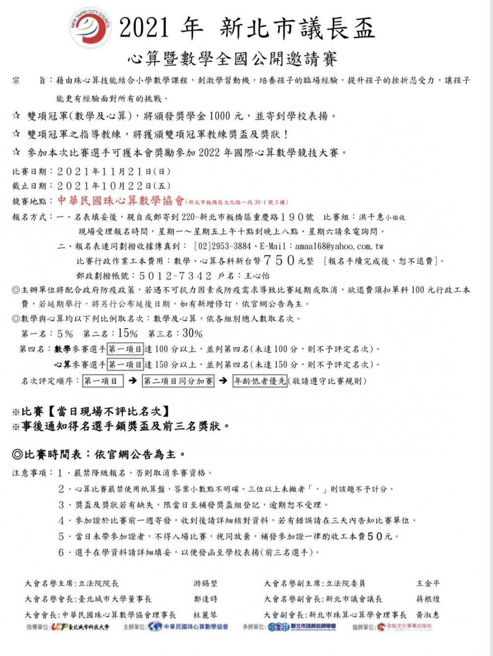 2021年 新北市議長盃心算暨數學全國公開邀請賽 比賽日期:110/11/21(日) 比賽地點:中華民國珠心算數學協會(新北市板橋區文化路一段30-1號3樓)