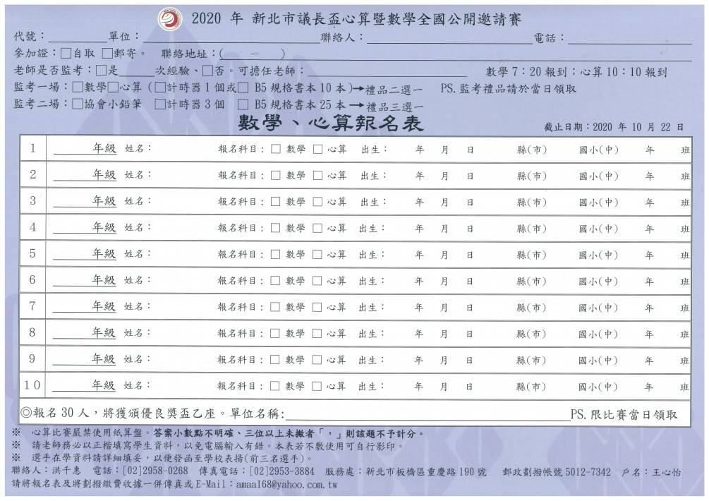 2020年新北市議長盃心算暨數學全國公開邀請賽