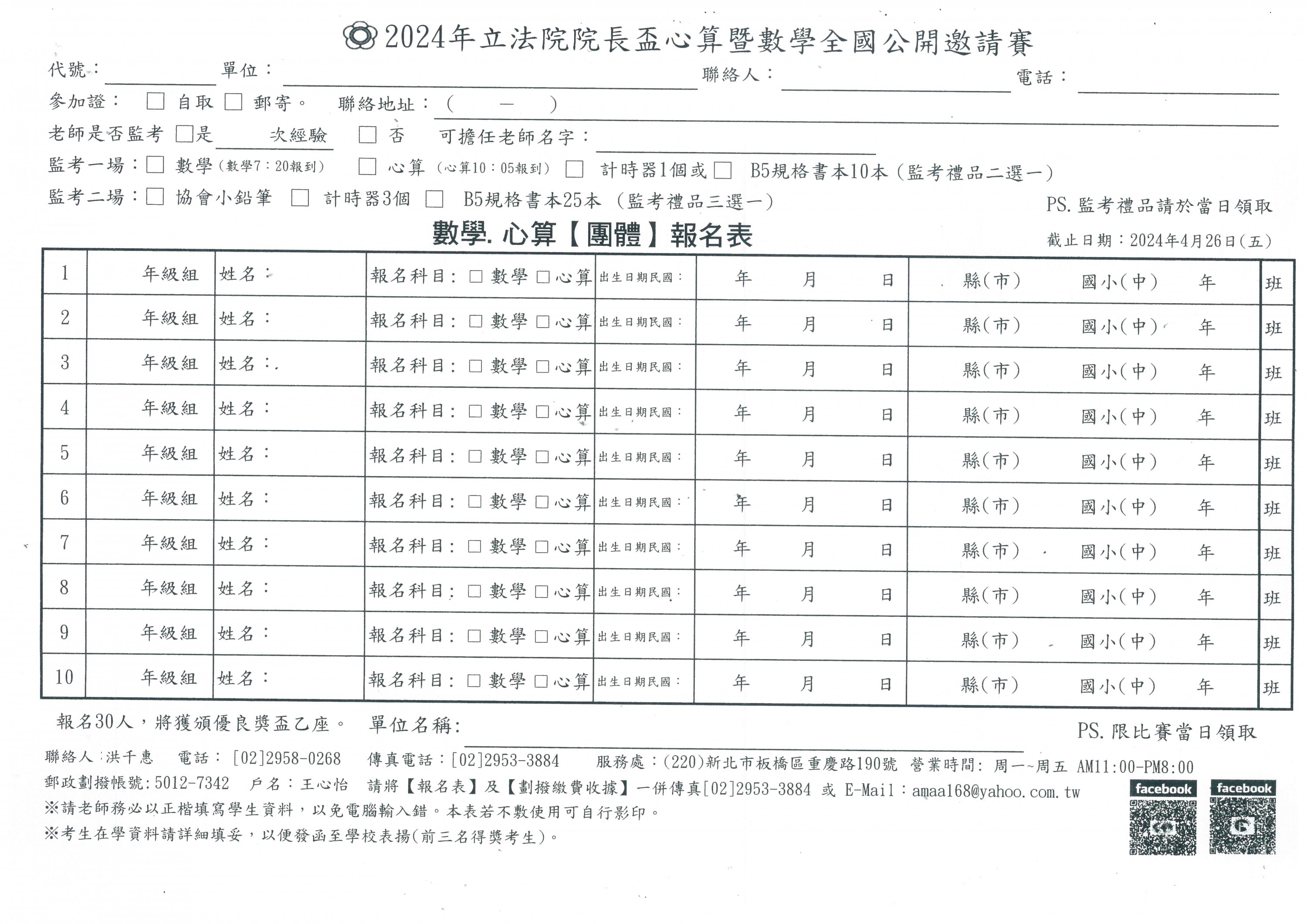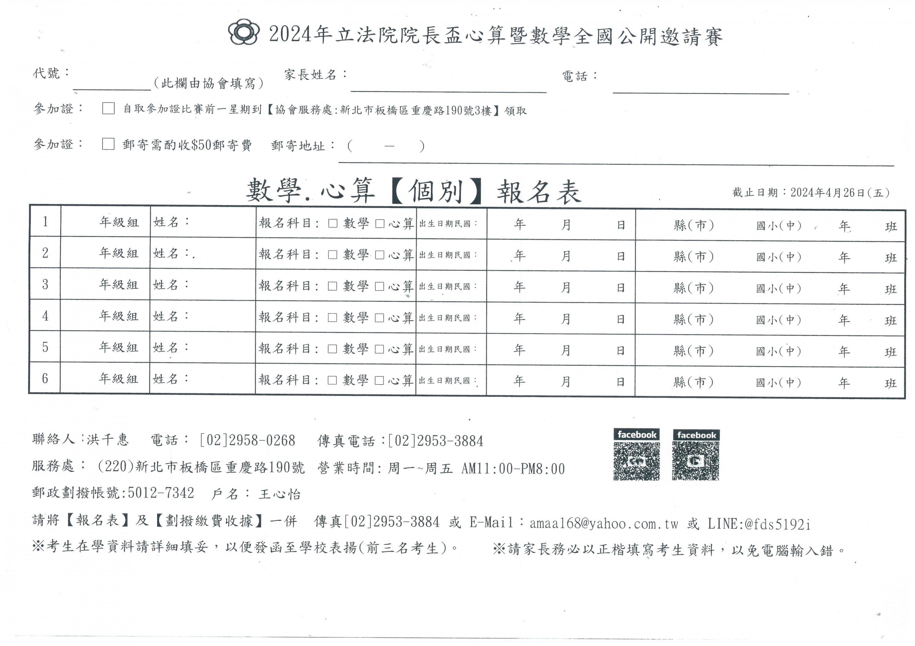 一、報名表填妥後,親自或郵寄到220-新北市板橋區重慶路190號 比賽組:洪千惠 小姐收