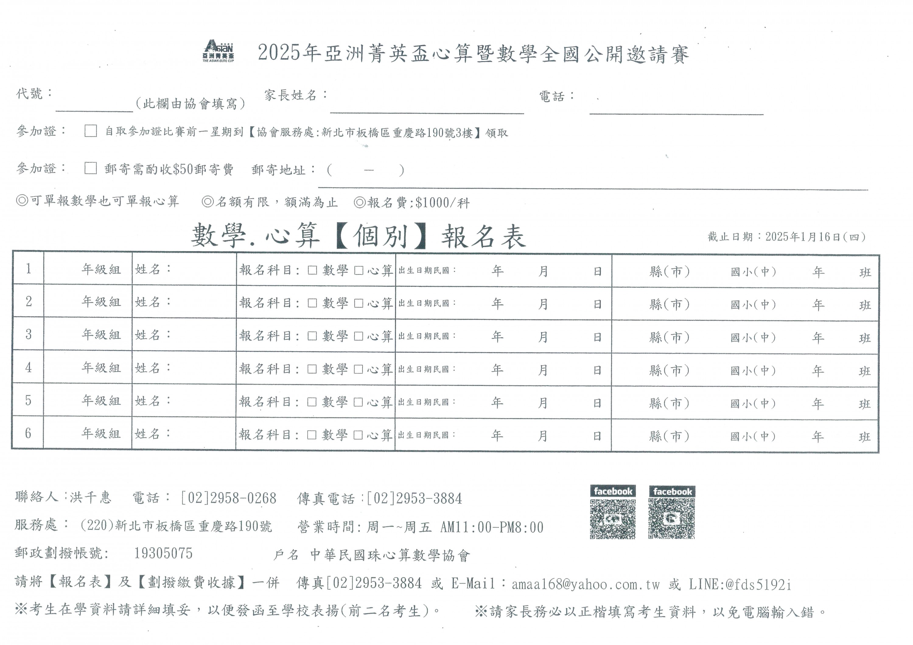 比賽行政作業工本費用:數學、心算各科新台幣1000元整。 [報名手續完成後,恕不退費]。